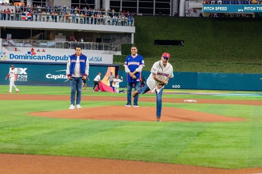 Tras completar el pitcheo, el jefe de Estado levantó de inmediato ambos brazos en señal de júbilo, gesto que fue celebrado por miles de aficionados dominicanos presentes en el estadio.