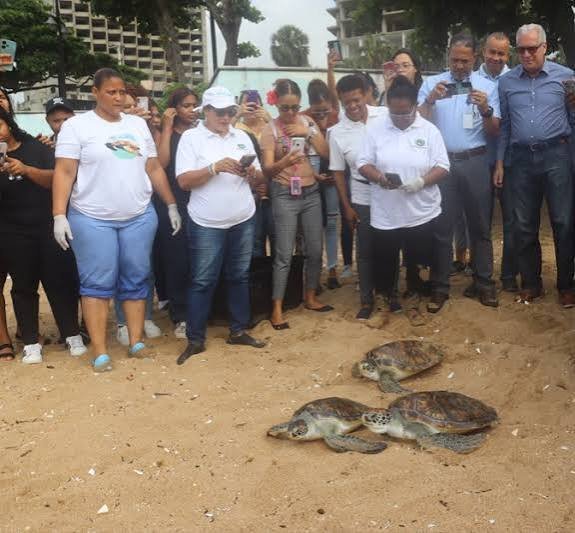 El Acuario Nacional realizó este miércoles, en la playa de Güibia del Distrito Nacional, la primera liberación del año de tres ejemplares juveniles de tortuga verde (Chelonia mydas), con los cuales desarrolló un proceso de rehabilitación que tuvo una duración de tres años.