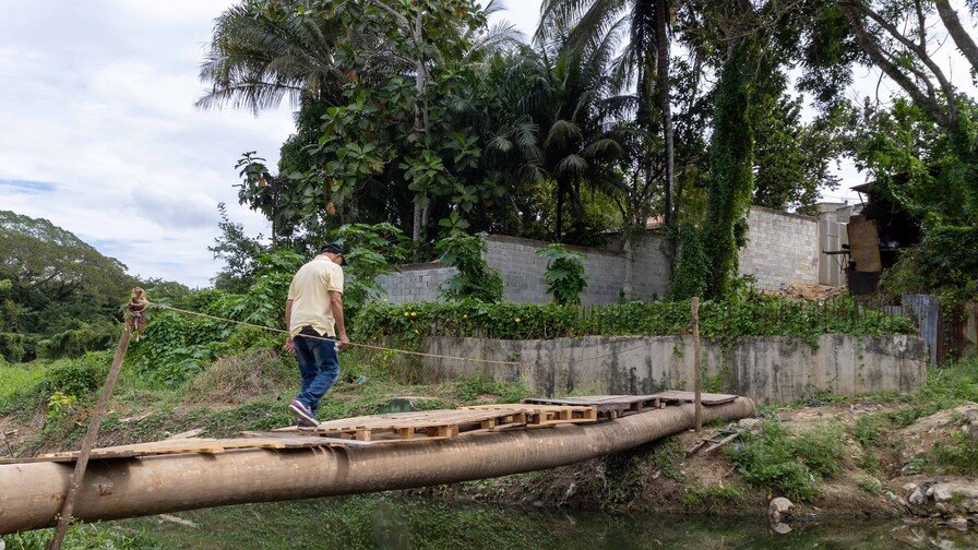 El puente se encuentra próximo a la sede de la Asociación de Propietarios de Guaguas de Cancino Adentro (Asoproguacade), agrupación que ha utilizado desde metal hasta troncos de palma para construir el paso.