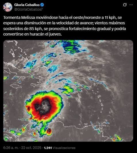 La directora del Indomet, Gloria Ceballos, informó a través de su cuenta en X que “la tormenta Melissa se mueve hacia el oeste/noroeste a 11 kilómetros por hora; se espera una disminución en la velocidad de avance, con vientos máximos sostenidos de 85 kilómetros por hora. Se pronostica un fortalecimiento gradual y podría convertirse en huracán el jueves”.